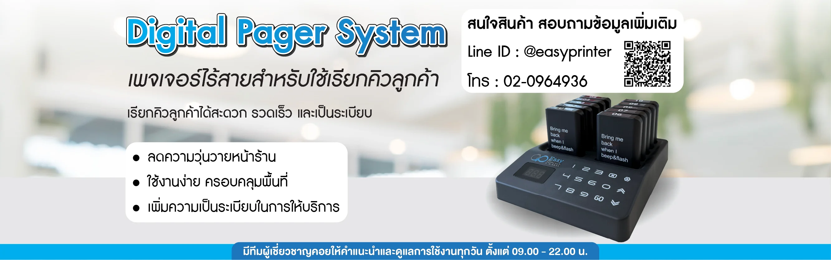 การจัดการคิวที่ดีไม่เพียงแต่ช่วยลดความรำคาญและความไม่พอใจของลูกค้า แต่ยังช่วยเพิ่มประสิทธิภาพในการดำเนินงานและสร้างภาพลักษณ์ที่ดีให้กับองค์กรอีกด้วย เพจเจอร์ไร้สายสำหรับใช้เรียกคิวลูกค้า Digital Pager System จึงเป็นนวัตกรรมที่ตอบโจทย์ความต้องการเหล่านี้ได้อย่างสมบูรณ์แบบ