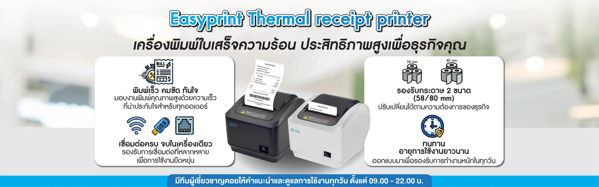 Easyprint เครื่องพิมพ์ใบเสร็จ ขนาด 58 mm 80 mm (Thermal Printer) ได้รับการออกแบบมาเพื่อตอบสนองความต้องการของธุรกิจสมัยใหม่ ไม่ว่าจะเป็นร้านค้าปลีก ร้านอาหาร คลินิก หรือธุรกิจบริการต่างๆ ด้วยเทคโนโลยี Thermal Printing ที่ทันสมัย ทำให้การพิมพ์ใบเสร็จเป็นเรื่องง่าย รวดเร็ว และประหยัดค่าใช้จ่าย